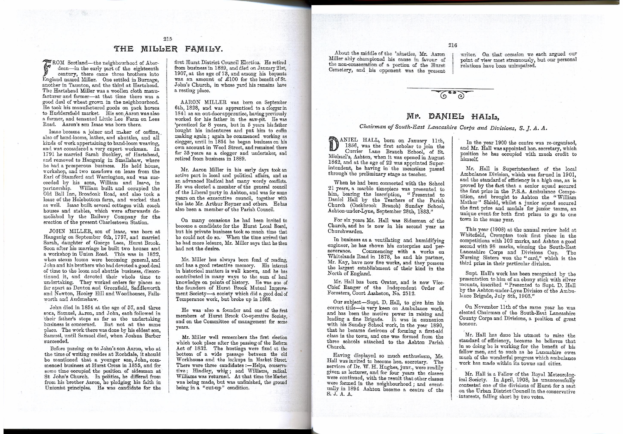 JOHN MILLER, son of Isaac, was born at Hangsnig on September 6th, 1797, and married Sarah, daughter of George Lees, Hurst Brook. Soon after his marriage he built two houses and a workshop in Union Road. This was in 1822, when steam looms were becoming general, and John and his brothers who had devoted a good deal of time to the loom and shuttle business, discontinued it, and devoted their whole time to undertaking. They worked orders for places so far apart as Denton and Greenfield, Saddleworth and Newton, Hooley Hill and Woodhouses, Failsworth and Audenshaw.